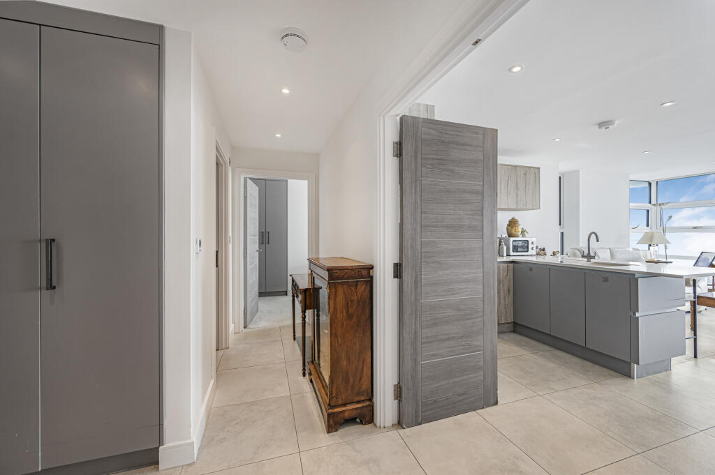 The accommodation which has under floor heating comprises an entrance hall with built in cupboards and which opens in to the spacious and open plan living/dining/kitchen area that features an expanse of floor to ceiling windows and doors opening onto the sea-facing balcony terrace. The kitchen is fitted in grey wood grain effect units with Quartz work surfaces and upstands and built in appliances including oven and microwave, dishwasher, fridge freezer and induction hob.
