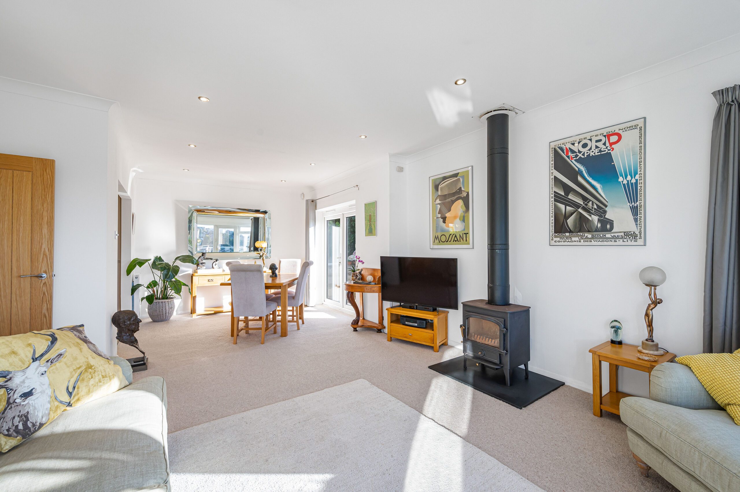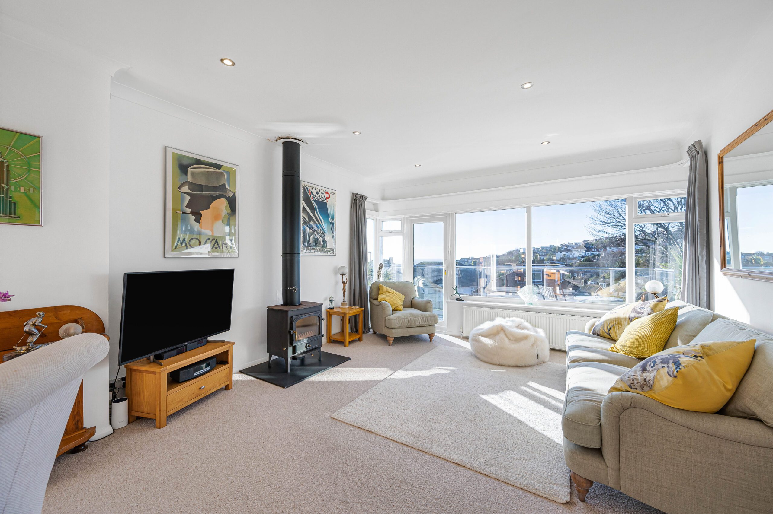 LOUNGE and OPEN PLAN DINING ROOM 25ft x 13ft6 (7.44m x 4.11m) with a stunning southerly aspect to the sea, opening onto the clear glazed open SUN BALCONY 13ft6 x 3ft11 (4.11m x 1.19m) and with an electrically operated Sun Awning. This delightful living area features a wood burner and French doors leading to the sun trap recently newly paved area.