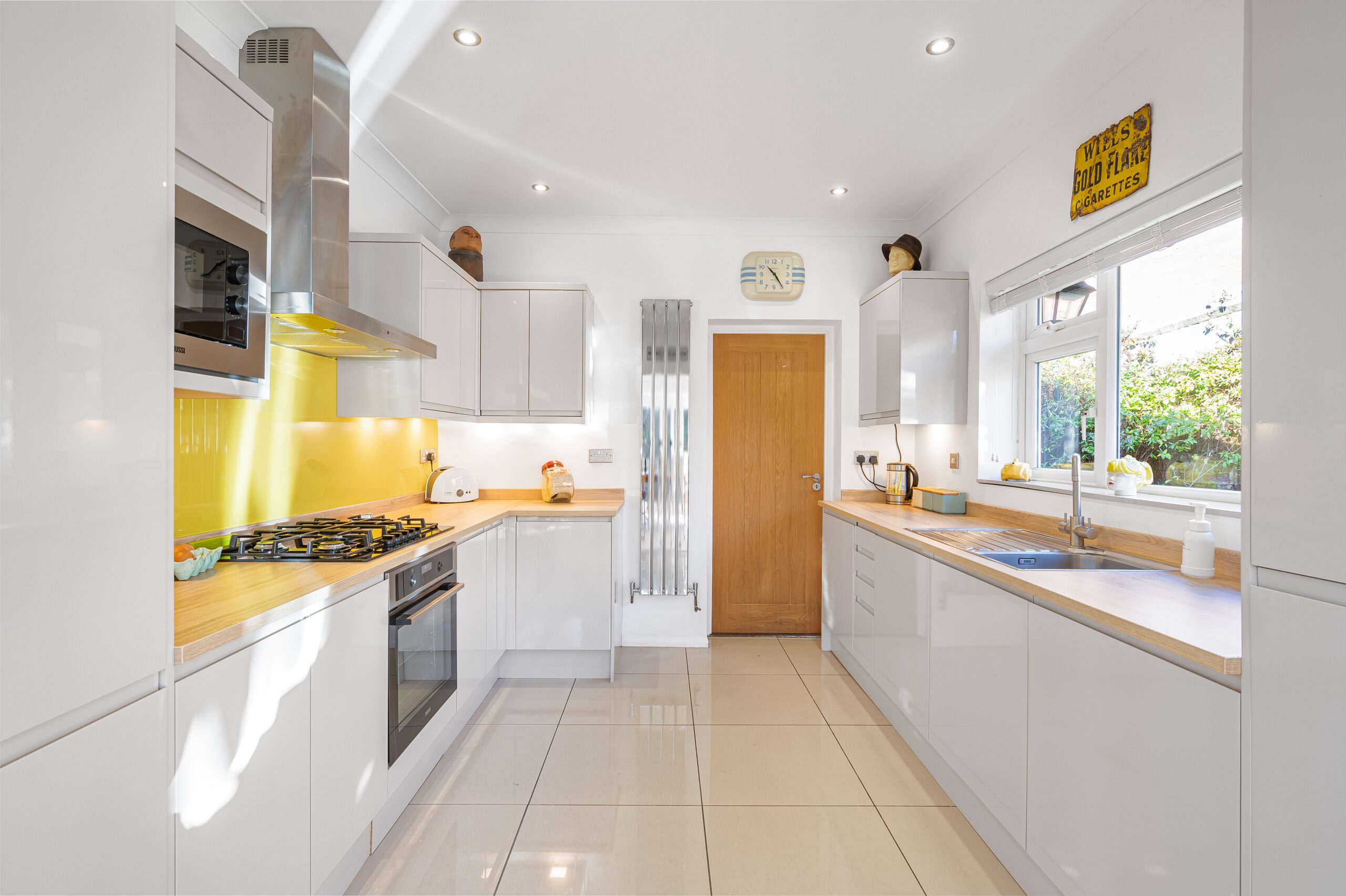 The newly fitted KITCHEN 11ft1 x 9ft9 (3.35m x 2.97m) boasts integrated appliances including fridge freezer, dishwasher, washing machine, 5 burner gas hob, oven, and gorgeous yellow glass splashbacks. chrome finish radiator, downlights, and the gas central heating boiler. From the kitchen, a door leads to the UTILITY AREA with downlights and French doors out to the rear paved garden.