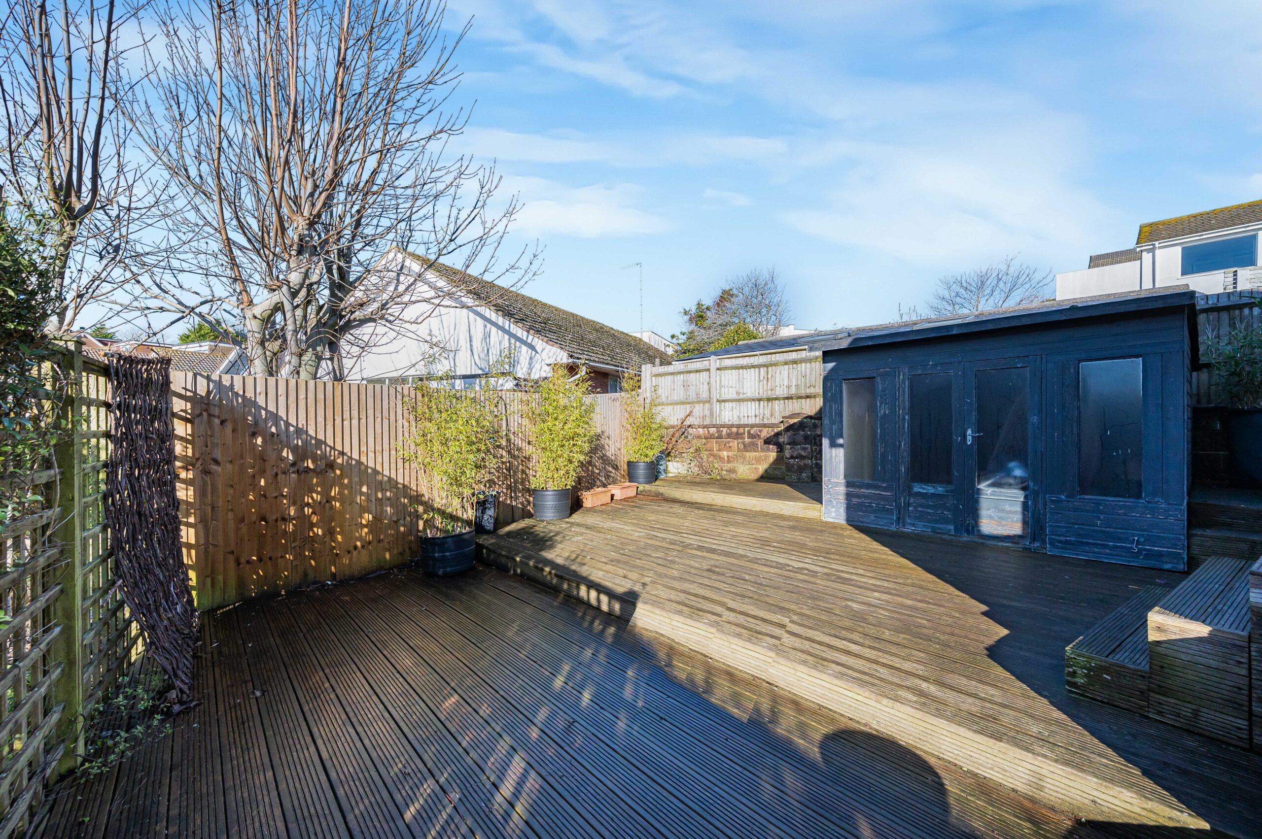 The front garden is formal with the parking/drive to the garage, the rear and side are a mix of decked and paved patio areas.