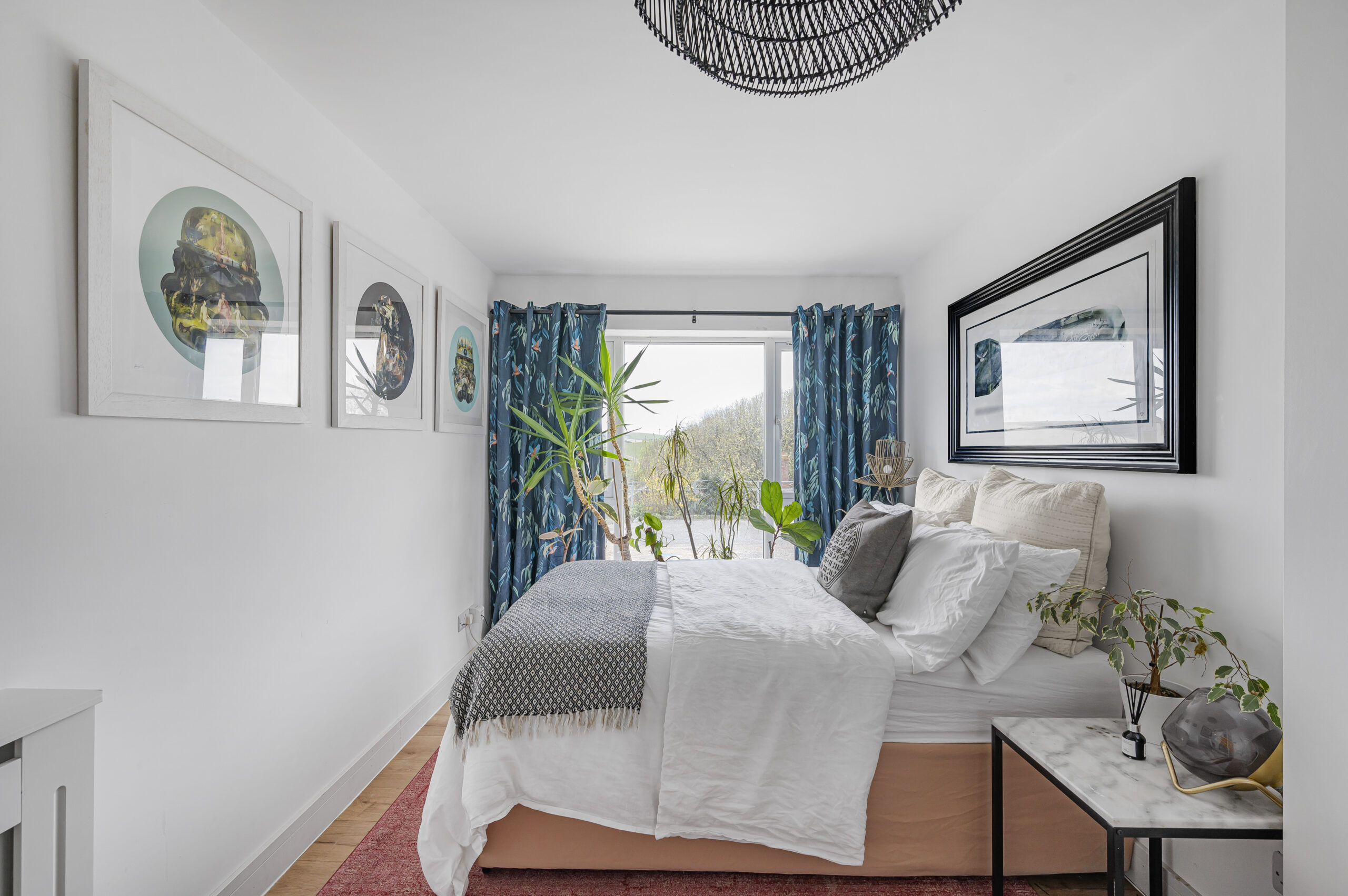 Arranged as an upside down house, the spacious Living Room has full height windows to capture the expansive downland views, whilst the separate Kitchen-Diner – with a smart navy units and oak worktops, freestanding Smeg dual-fuel range cooker, integrated dishwasher, fridge & freezer, and ample pantry style storage – opens onto the fabulous landscaped rear garden.