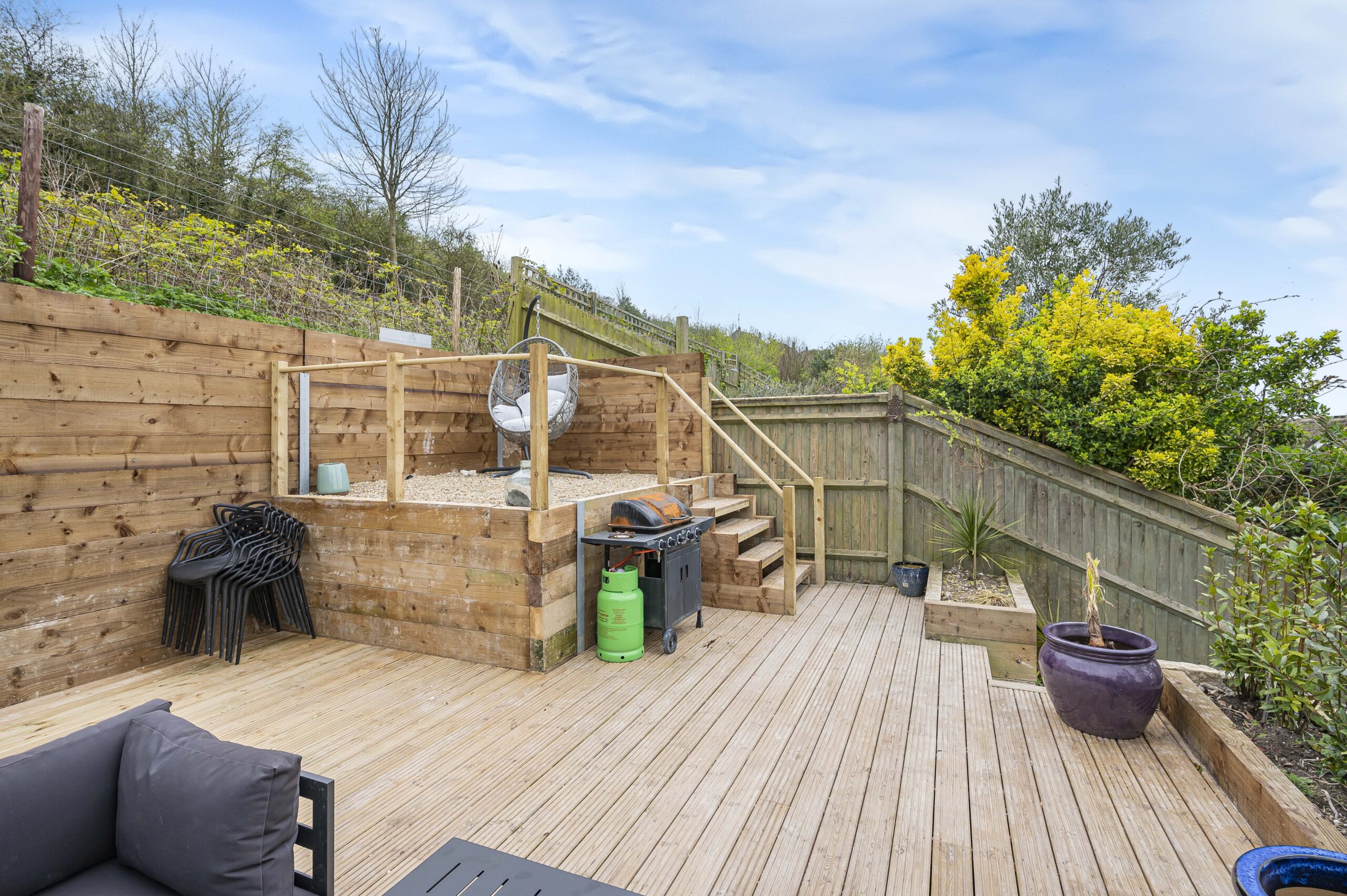 To the front, the house has a formal front garden with off-street parking, and handy side access leading to the landscaped rear garden which has been tiered to provide generous outdoor living space with panoramic views. Areas of patio, decking and stones are interspersed with creative planting to give flexible zones to relax and entertain.