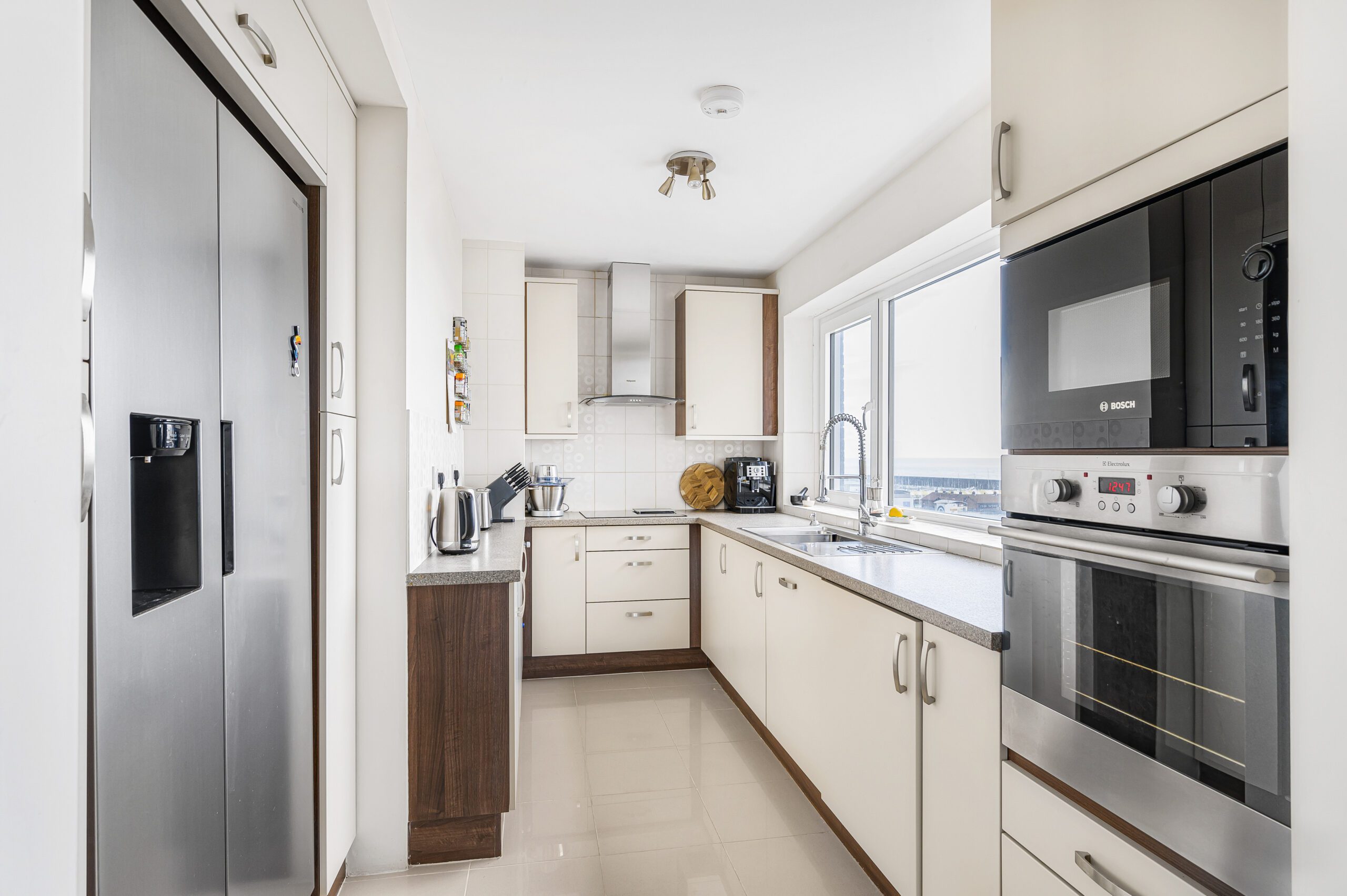 The kitchen is just off the lounge and has a modern finish with a large window, again with the panoramic views. The built-in appliances include an integrated oven, microwave, washer/dryer, dishwasher, induction hob and hood. There are two double bedrooms both with fitted wardrobes and a bathroom and shower room, both in superb decorative order.